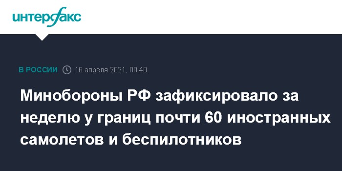 Москва. 16 апреля. INTERFAX.RU - Сорок три иностранных самолета и 15 беспилотников в течение недели вели разведку у российских границ, следует из данных Минобороны РФ, которые опубликованы в ведомственной газете "Красная звезда" в пятницу.