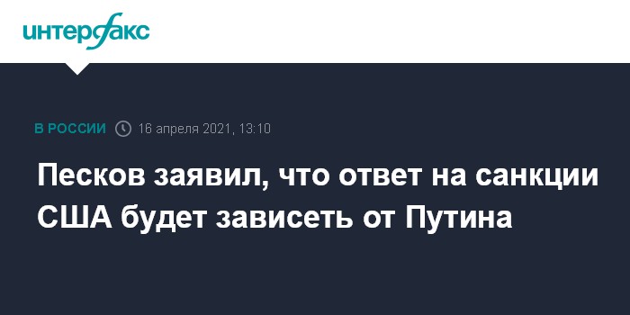 Москва. 16 апреля. INTERFAX.RU - Москва планирует ответить на новые санкции США по принципу взаимности, последнее слово - за президентом РФ Владимиром Путиным, сообщил пресс-секретарь главы государства Дмитрий Песков.