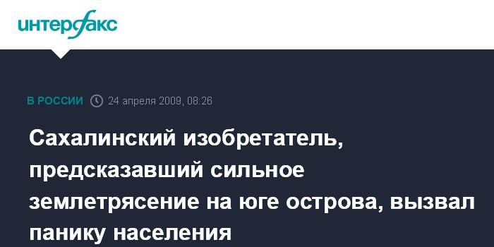 Москва. 24 апреля. INTERFAX.RU - Заявление сахалинского изобретателя прибора для выдачи краткосрочных прогнозов землетрясений Евгения Васина, что на юге Сахалина в ближайшие двое суток, по его прогнозу, может быть сильное землетрясение магнитудой 5,5, вызвало панику у сахалинцев.