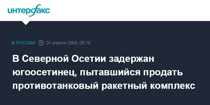 Москва. 24 апреля. INTERFAX.RU - В республике Северная Осетия-Алания сотрудники МВД РФ задержали гражданина Южной Осетии, пытающегося сбыть ПТРК "Фагот", сообщил источник в правоохранительных органах.