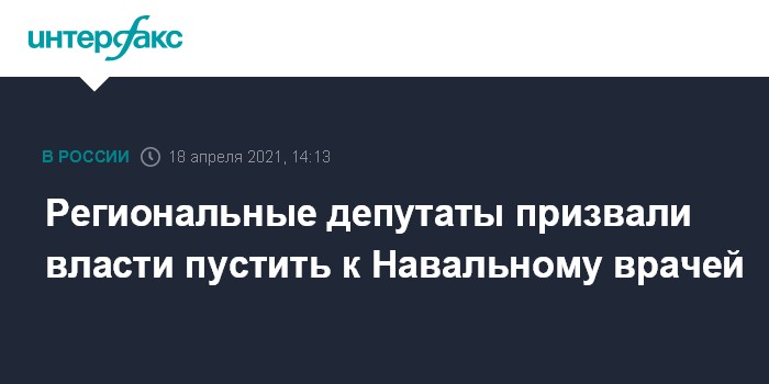 Москва. 18 апреля. INTERFAX.RU - Несколько депутатов законодательных собраний России обратились к президенту России Владимиру Путину, заявив о необходимости допуска врачей и оказания срочной медицинской помощи оппозиционеру Алексею Навальному, который находится в колонии во Владимирской области.