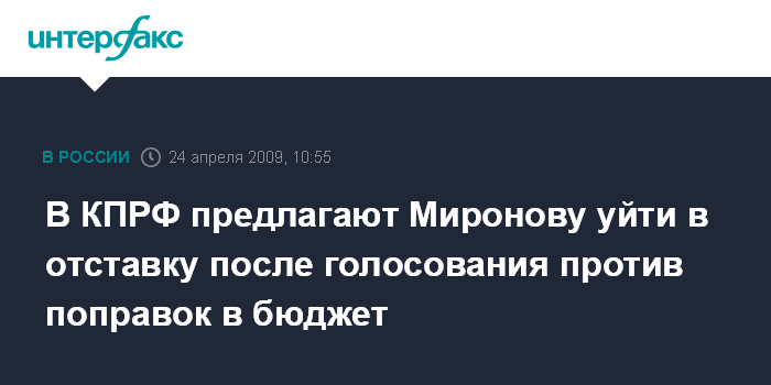 Москва. 24 апреля. INTERFAX.RU - В руководстве КПРФ считают, что Сергей Миронов, проголосовавший 22 апреля против антикризисных поправок в бюджет страны, должен уйти в отставку с поста председателя Совета Федерации, заявил вице-спикер Госдумы, первый зампред ЦК КПРФ Иван Мельников.
