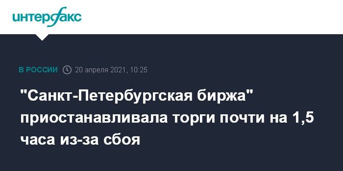 Москва. 20 апреля. INTERFAX.RU - "Санкт-Петербургская биржа" ночью приостанавливала торги иностранными ценными бумагами с 00:00 по 1:20 по московскому времени из-за технического сбоя, следует из материалов биржи.