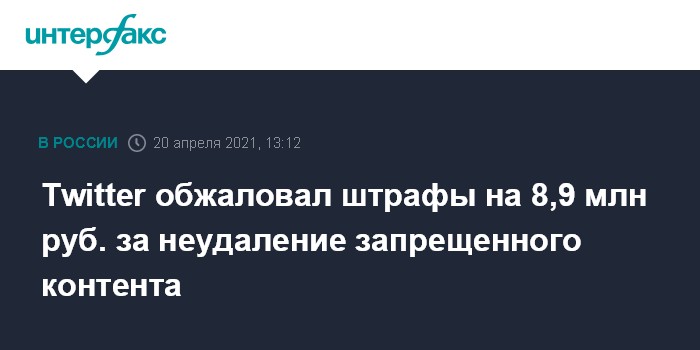 Москва. 20 апреля. INTERFAX.RU - Twitter просит апелляционную инстанцию отменить решения о назначении компании административных штрафов на общую сумму 8,9 млн рублей (более $116 тысяч) из-за неудаления контента с призывами к подросткам выйти на несанкционированные протестные акции в конце января.