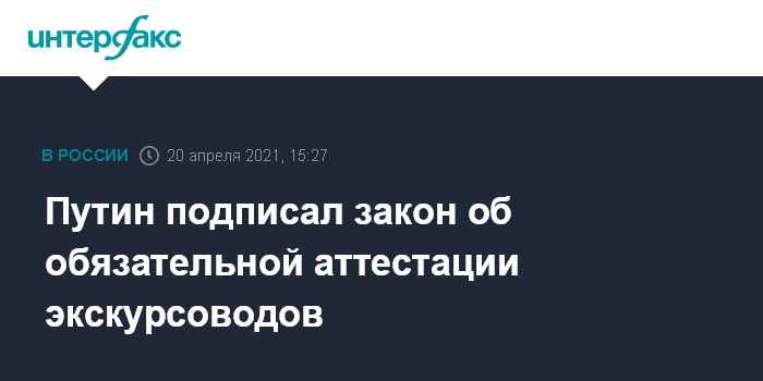 Москва. 20 апреля. INTERFAX.RU - Президент РФ Владимир Путин во вторник подписал закон о порядке обязательной аттестации экскурсоводов и гидов-переводчиков и запрете на проведение экскурсий для иностранцев. Документ опубликован на официальном интернет-портале правовой информации.