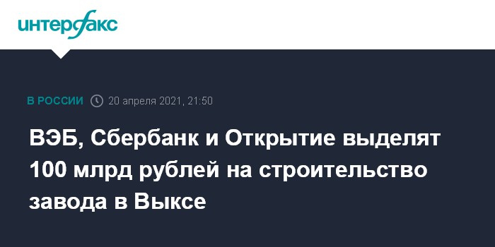 ВЭБ, Сбербанк и Открытие выделят 100 млрд рублей на строительство завода в Выксе