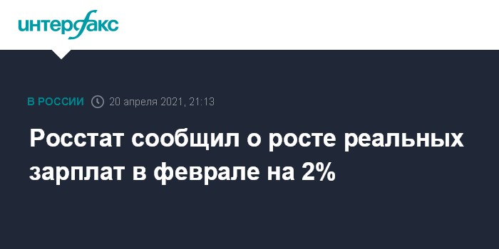 Москва. 20 апреля. INTERFAX.RU - В феврале в России рост реального размера (с поправкой на инфляцию) зарплат составил 2% в годовом выражении после повышения на 0,1% в январе, на 4,6% в декабре, на 0,2% в ноябре, 0,5% в октябре, сообщил Росстат.