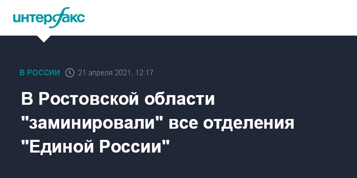 Москва. 21 апреля. INTERFAX.RU - Свыше 60 отделений партии "Единая Россия" в Ростовской области проверяют после сообщения о минировании, сообщил "Интерфаксу" информированный источник.