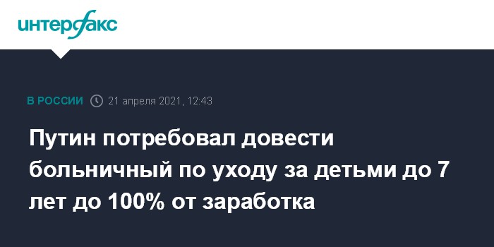 Москва. 21 апреля. INTERFAX.RU - В России матерям будут оплачивать больничный по уходу за ребенком в возрасте до семи лет в размере 100% от заработка, вне зависимости от стажа, пообещал в послании Федеральному собранию президент Владимир Путин.