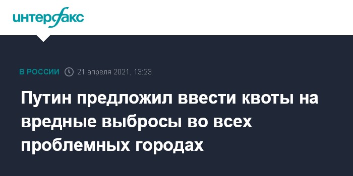 Москва. 21 апреля. INTERFAX.RU - Президент Владимир Путин предложил распространить систему квотирования вредных выбросов в атмосферу на все города России, где есть острая проблема с качеством воздуха. Он сказал об этом, оглашая послание Федеральному собранию.