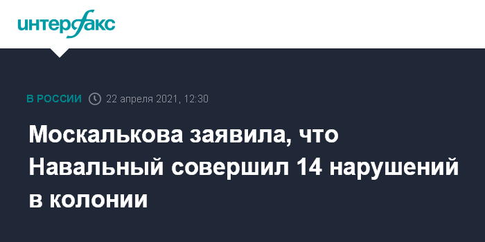 Москва. 22 апреля. INTERFAX.RU - Оппозиционер Алексей Навальный 14 раз нарушил порядок содержания в колонии, заявила уполномоченный по правам человека в РФ Татьяна Москалькова.