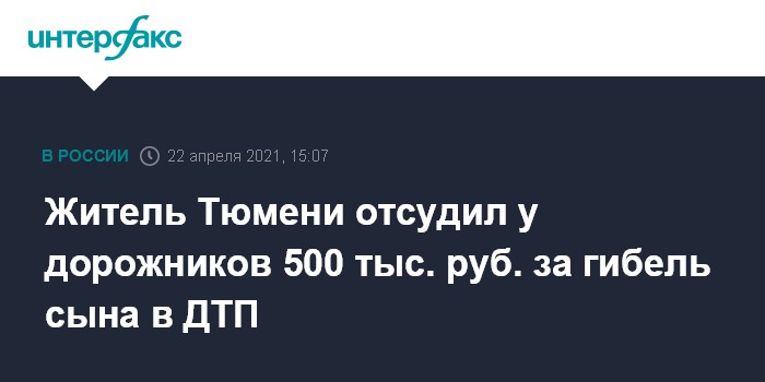 Москва. 22 апреля. INTERFAX.RU - Суд в Тюмени взыскал с городского департамента дорожной инфраструктуры и "Службы заказчика по благоустройству" 500 тысяч рублей в пользу местного жителя за гибель сына в ДТП. Об этом сообщает в четверг пресс-служба областной прокуратуры.