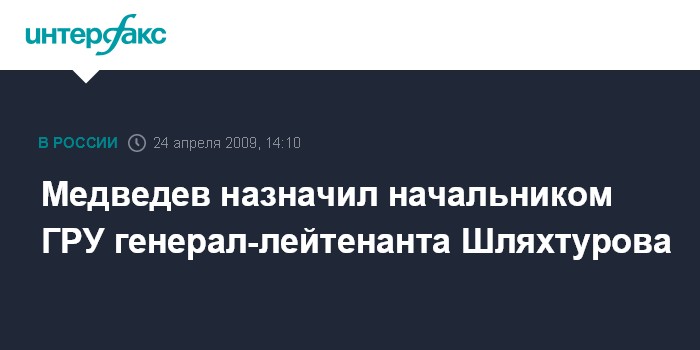 Москва. 24 апреля. INTERFAX.RU - Президент РФ Дмитрий Медведев подписал указ о назначении Александра Шляхтурова начальником Главного разведуправления Генштаба Минобороны - замначальника Генштаба, освободив его от должности первого замглавы ГРУ.