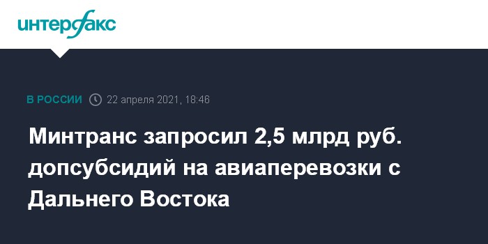 Москва. 22 апреля. INTERFAX.RU - Минтранс РФ запросил 2,5 млрд рублей дополнительных субсидий на авиаперевозки жителей Дальнего Востока в центральную часть РФ. Об этом сообщил замдиректора департамента госполитики в области гражданской авиации ведомства Илья Белавинцев.