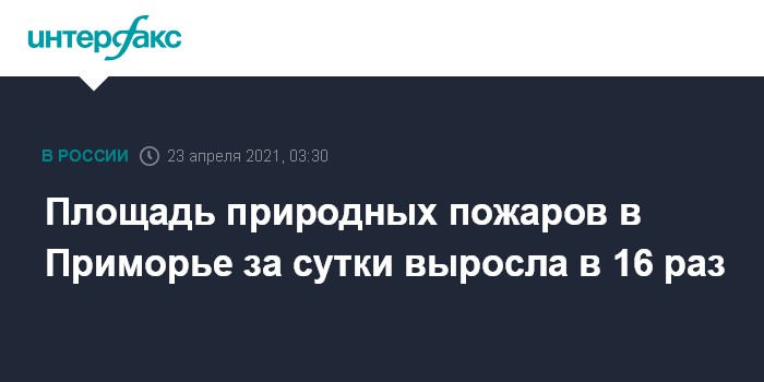 Москва. 23 апреля. INTERFAX.RU - Количество природных пожаров в Приморском крае за сутки удвоилось, а площадь выросла в 16 раз, до 514 га, следует из данных Федеральной авиалесоохраны.