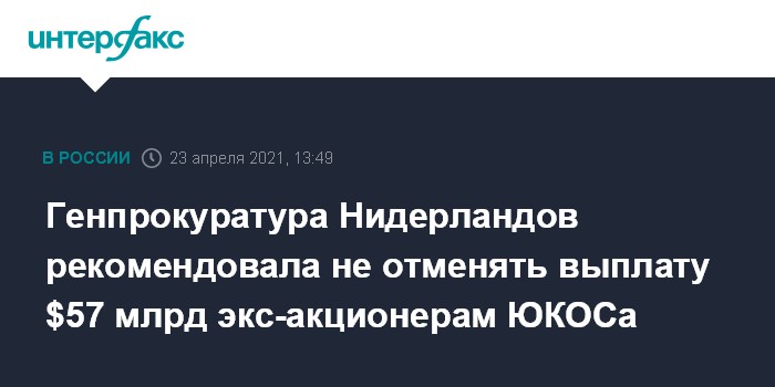 Москва. 23 апреля. INTERFAX.RU - Генпрокуратура Нидерландов сообщила, что рекомендует Верховному суду страны отклонить кассационную жалобу России на решение апелляционного суда о выплате компенсации в $57 млрд бывшим акционерам ЮКОСа и оставить уже вынесенный вердикт в силе.