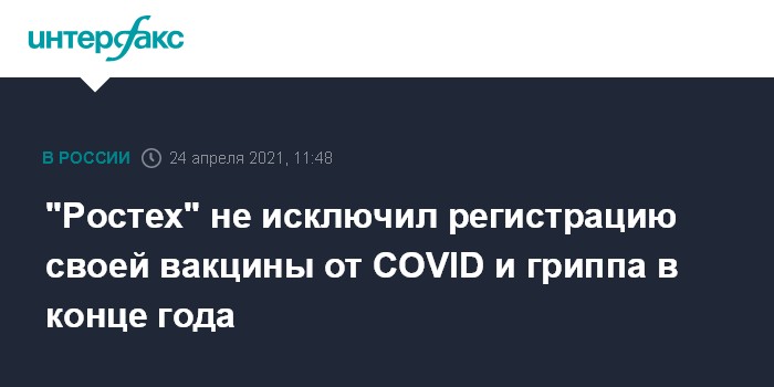 Москва. 24 апреля. INTERFAX.RU - Комплексная вакцина от коронавируса и гриппа разработки "Ростеха" может быть зарегистрирована до конца текущего года или в начале 2022 года, заявил глава госкорпорации Сергей Чемезов.