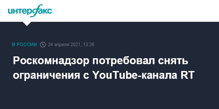 Москва. 24 апреля. INTERFAX.RU - Роскомнадзрор (РКН) направил в адрес компании Google письмо с требованием снять ограничения с YouTube-канала российского СМИ Russia Today.