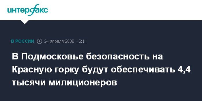Москва. 24 апреля. INTERFAX.RU - В воскресенье в 783 церквях и на 558 кладбищах Московской области пройдет празднование "Красной горки", в котором, как предполагается, примут участие более 330 тыс. человек, сообщили "Интерфаксу" в пятницу в Управлении информации и общественных связей ГУВД Московской области. Там рассказали, что в целях обеспечения общественного порядка и безопасности церкви и кладбища будут обследованы с применением технических средств и служебных собак. Кроме того, налажено взаимодействие подмосковных милиционеров со столичным ГУВД, московским УВД на транспорте, подразделениями УФСБ по Москве и области, прокуратурой, Главным управлением региональной безопасности по Московской области, представителями Русской православной Церкви, другими ведомствами.
