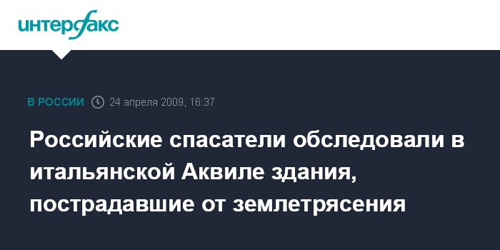 Москва. 24 апреля. INTERFAX.RU - Специалисты МЧС России завершили работы по обследованию зданий в городе Аквила (Италия), пострадавшем от сильнейшего землетрясения.