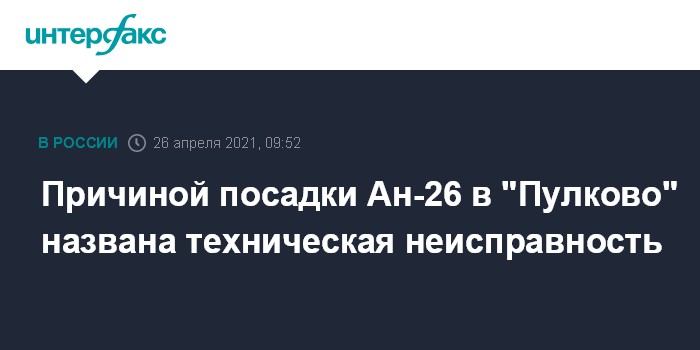 Москва. 26 апреля. INTERFAX.RU - Грузовой Ан-26 аварийно сел в "Пулково" после того, как экипаж сообщил наземным службам о технической неисправности самолета, подтвердили "Интерфаксу" в пресс-службе ООО "Воздушные ворота северной столицы" (ООО "ВВСС").