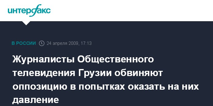 Москва. 24 апреля. INTERFAX.RU - Коллектив Общественного телевидения Грузии в пятницу распространил заявление, в котором говорится, что лидеры и сторонники оппозиции пытаются оказывать на журналистов давление. "В последние дни со стороны радикального крыла политической оппозиции давление и угрозы на журналистов Первого канала (Общественное телевидение Грузии - ИФ) лишь усилилось", - говорится в заявлении Общественного телевидения. "Несмотря на давление со стороны активистов оппозиции Первый телеканал и его журналисты будут соблюдать закон и кодекс Грузии о правилах вещания", - подчеркивается в заявлении.