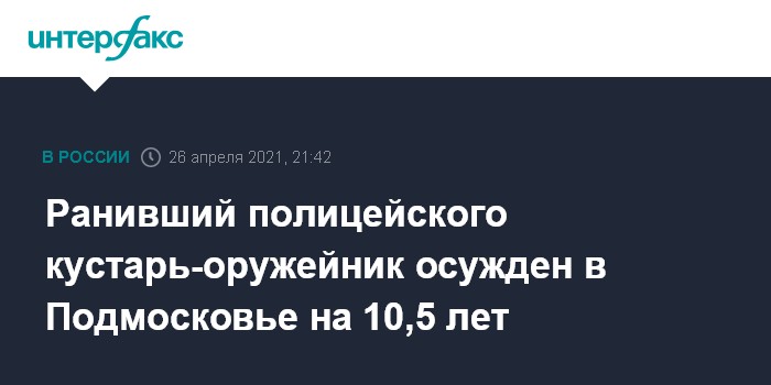 Москва. 26 апреля. INTERFAX.RU - Житель подмосковного Солнечногорска, подпольный оружейник Виталий Арсеньев приговорен к 10,5 годам заключения за ранение полицейского в ходе обыска, сообщила представитель областного главка Следственного комитета (СК) Ольга Врадий.