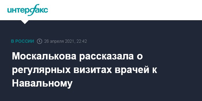 Москва. 26 апреля. INTERFAX.RU - Российского оппозиционера Алексея Навального, который отбывает наказание в колонии во Владимирской области, с 24 марта по 20 апреля регулярно посещали врачи; уполномоченный по правам человека в РФ Татьяна Москалькова ознакомилась с результатами обследований, сообщает пресс-служба омбудсмена.