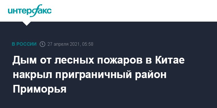 Москва. 27 апреля. INTERFAX.RU - Задымление от природных пожаров в Китае отмечено в приграничном районе Приморского края, сообщил во вторник "Интерфаксу" пресс-секретарь Примгидромета Виктор Чулков.