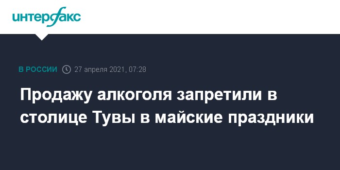 "Запретить в период времени с 1 мая по 10 мая 2021 года розничную продажу алкогольной продукции, в том числе и пива, во всех торговых точках (кроме услуг общественного питания) города Кызыла", - говорится в сообщении со ссылкой на текст постановления.