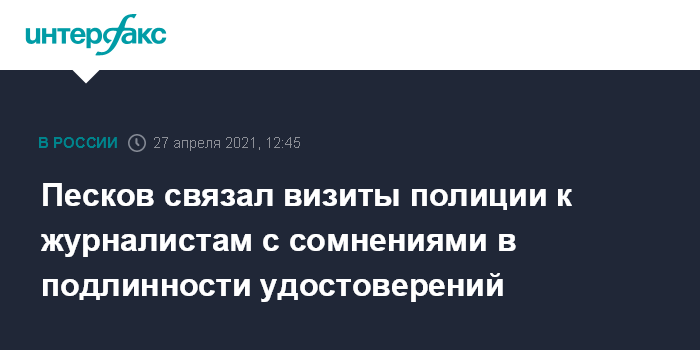 "Мы действительно видели эту информацию. Мы точно не знаем, с чем связана эта работа УВД и полиции. Я могу предположить, там же был у нас случай, когда нежурналист находился на незаконном митинге с журналистским удостоверением, то есть, не являясь журналистом, он получил журналистское удостоверение. Я не исключаю, что это связано с этим", - сказал Песков журналистам во вторник, комментируя информацию о визитах полиции к журналистам и задержании некоторых из них.