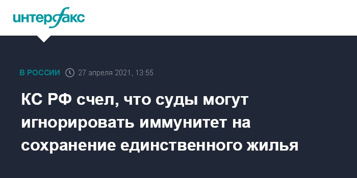 Москва. 27 апреля. INTERFAX.RU - Запрет на изъятие у граждан-должников единственного жилья не может быть безусловным и требует законодательных корректив, а до их появления суды вправе принимать решения о преодолении имущественного иммунитета, если должник в результате не останется без пригодного для жизни помещения, следует из опубликованного во вторник постановления Конституционного суда (КС) РФ.