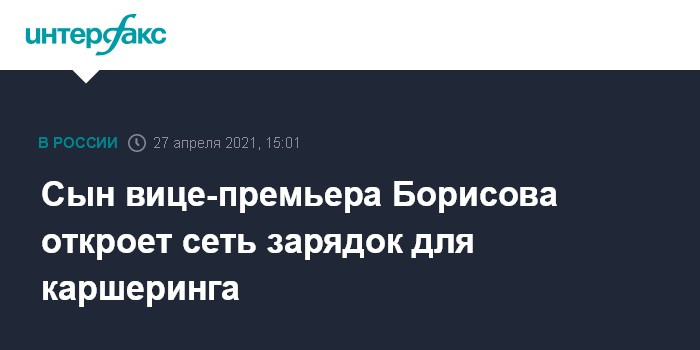 Москва. 27 апреля. INTERFAX.RU - Сын вице-премьера Юрия Борисова Константин Борисов планирует развивать сеть зарядок для каршеринговых электромобилей. По данным ЕГРЮЛ, в апреле Борисов стал соучредителем ООО "Оператор заправочных станций" (ОЗС). Компания была зарегистрирована 15 апреля в Москве.