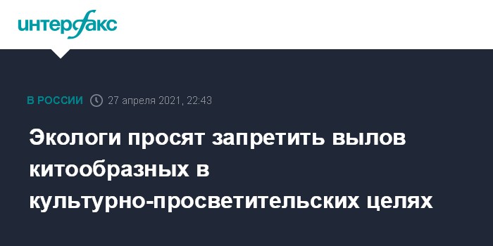Москва. 27 апреля. INTERFAX.RU - Представители Гринпис России считают, что необходимо запретить вылов морских млекопитающих в учебных и культурно-просветительских целях. Новый законопроект, подготовленный правительством, не запрещает вылов китообразных в этих целях, сообщают в пресс-службе российского отделения Гринпис.