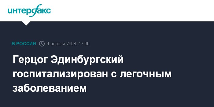 Лондон. 4 апреля. INTERFAX.RU - Герцог Эдинбургский попал в больницу с легочным заболеванием. Информацию об этом распространил сегодня Букингемский дворец.