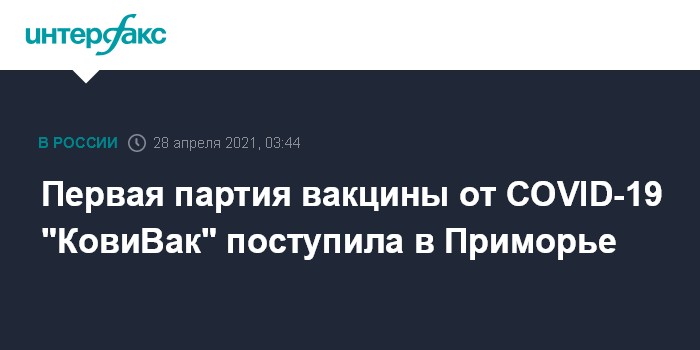 Москва. 28 апреля. INTERFAX.RU - Первая партия вакцины от коронавируса "КовиВак", разработанная центром имени Чумакова, поступила в Приморье, препарат будет использоваться преимущественно в мобильных прививочных пунктах, сообщила в среду пресс-служба правительства региона.