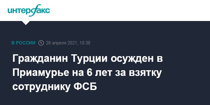Москва. 28 апреля. INTERFAX.RU - Свободненский городской суд приговорил гражданина Турции к шести годам колонии строгого режима и оштрафовал на 10 млн рублей. Иностранец пытался подкупить сотрудника ФСБ и избежать проверок, которые могли бы выявить факты незаконной миграции иностранных граждан.