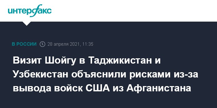Москва. 28 апреля. INTERFAX.RU - Поездки министра обороны России Сергея Шойгу в Таджикистан и Узбекистан, где он провел двусторонние переговоры с главами военных ведомств этих республик, обусловлены, прежде всего, озабоченностями в связи с обстановкой, складывающейся в соседнем Афганистане на фоне вывода из страны американских войск, сообщил "Интерфаксу" в среду военно-дипломатический источник.
