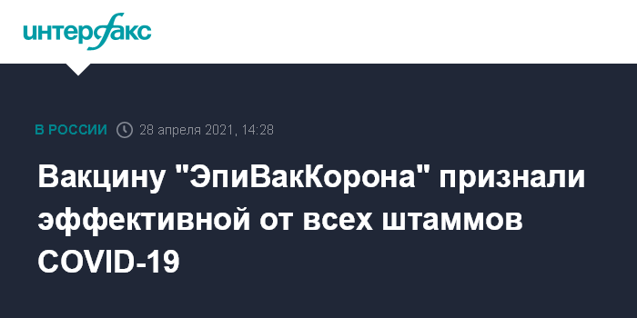 Москва. 28 апреля. INTERFAX.RU - Вакцина "ЭпиВакКорона" научного центра "Вектор" Роспотребнадзора эффективна против всех штаммов коронавируса, заявила заместитель генерального директора по научно-методической работе и международному сотрудничеству центра "Вектор" Татьяна Непомнящих.