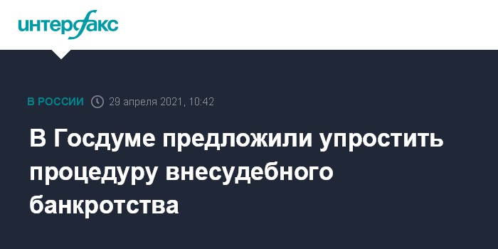 Москва. 29 апреля. INTERFAX.RU - В Госдуме предложили упростить процедуру внесудебного банкротства для пенсионеров и малоимущих россиян с доходами менее двух прожиточных минимумов. Такие граждане смогут инициировать внесудебное банкротство даже если у них нет имущества, на которое можно обратить взыскание по исполнительным документам.