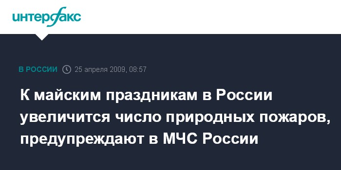 Москва. 25 апреля. ИНТЕРФАКС - Центр "Антистихия" МЧС России предупреждает о возможном увеличении числа природных пожаров в связи с теплой и сухой погодой на большей части РФ.