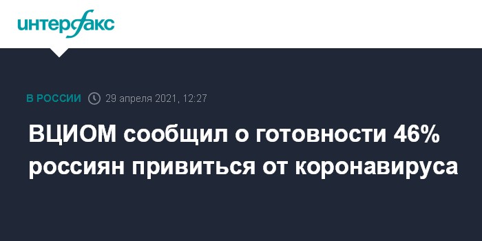 Москва. 29 апреля. INTERFAX.RU - Сделать прививку от COVID-19 готовы 46% россиян, 11% ее уже сделали, показал опрос ВЦИОМа. Об этом сообщил на пресс-конференции директор центра по работе с органами государственной власти Кирилл Родин.