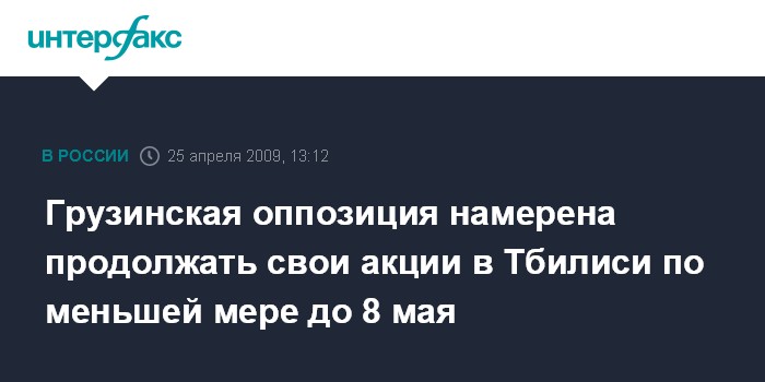 Москва. 25 апреля. INTERFAX.RU - Оргкомитет акций протеста грузинской оппозиции обратился в мэрию Тбилиси с предупреждением о продлении срока проведения своих мероприятий до 8 мая, сообщили "Интерфаксу" в субботу в мэрии.