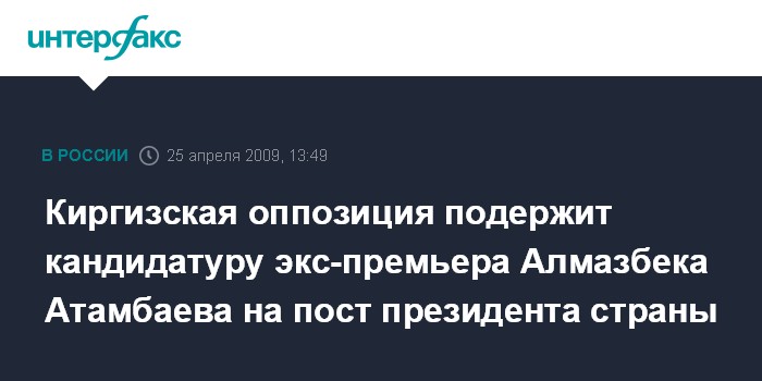Москва. 25 апреля. INTERFAX.RU - Оппозиционное Объеденное народное движение (ОНД) на курултае (собрании) в субботу заявило о готовности поддержать бывшего премьер-министра Киргизии, лидера Социал-демократической партии республики Азмазбека Атамбаева кандидатом в президенты Киргизии.