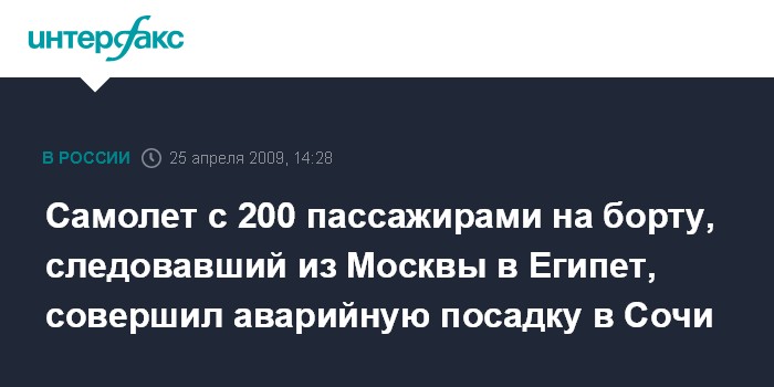 Москва. 25 апреля. INTERFAX.RU - Самолет Ту-204, выполнявший рейс из московского аэропорта "Внуково" в Шарм-эль-Шейх (Египет), совершил аварийную посадку в сочинском аэропорту Адлер в 13:13 мск в субботу.
