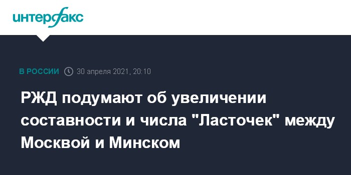 Москва. 30 апреля. INTERFAX.RU - ОАО "Российские железные дороги" (РЖД) могут увеличить составность поездов "Ласточка" и количество рейсов на маршруте между Москвой и Минском.
