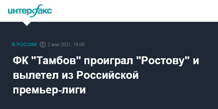 Москва. 2 мая. INTERFAX.RU - Футбольный клуб "Тамбов" в воскресенье в 28-м туре Тинькофф РПЛ уступил "Ростову", обеспечив себе последнее место в турнирной таблице чемпионата России.