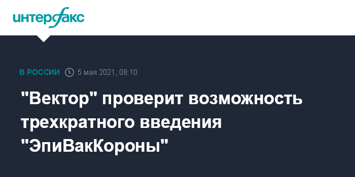 Москва. 5 мая. INTERFAX.RU - Научный центр "Вектор" проверяет возможность трехкратного введения вакцины от коронавируса "ЭпиВакКорона", чтобы усилить действие антител, сообщил заведующий отделом зоонозных инфекций ГНЦ "Вектор" Роспотребнадзора Александр Рыжиков.