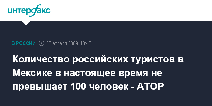 Москва. 26 апреля. INTERFAX.RU - В Мексике сейчас может находиться не более 100 российских туристов. По имеющимся на сегодня данным, им ничего не угрожает, сообщает исполнительный директор Ассоциации туроператоров РФ (АТОР) Майя Ломидзе.