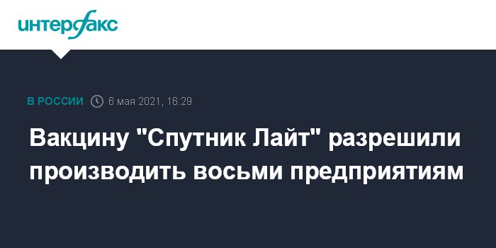 Москва. 6 мая. INTERFAX.RU - Вакцину "Спутник Лайт" смогут производить восемь предприятий в России, следует из данных реестра лекарственных средств Минздрава.
